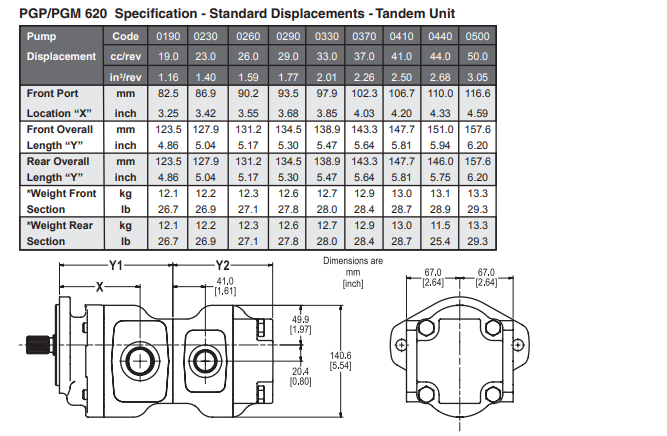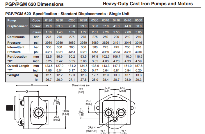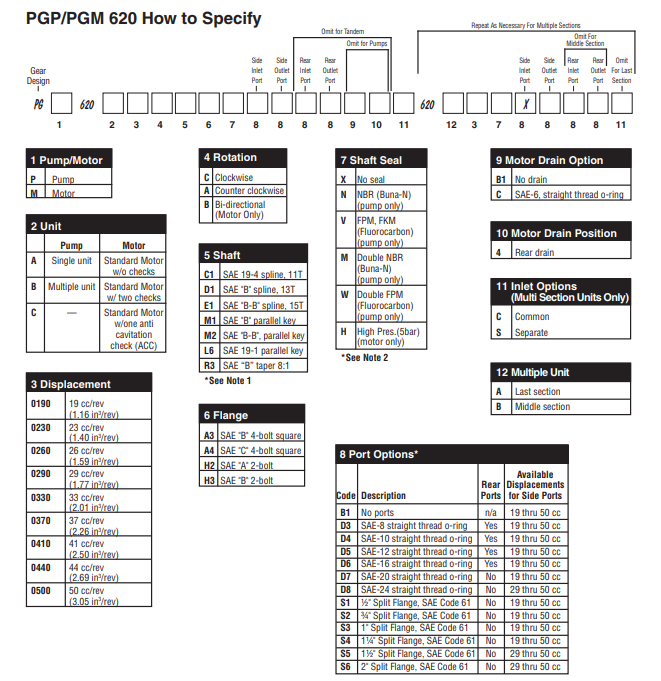 單個Parker PGP620系列泵有12種排量,從16cc / rev到52cc / rev:PGP620A-0160 | PGP620A-0190 | PGP620A-0230 | PGP620A-0260 | PGP620A-0290 | PGP620A-0330 | PGP620A-0360 | PGP620A-0370 | PGP620A-0410 | PGP620A-0440 | PGP620A-0500 | PGP620A-0520