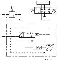 這種控制針對恒定的系統(tǒng)壓力,自動(dòng)地改變泵的排量,滿足系統(tǒng)的流量要求,在補(bǔ)償器設(shè)定的14bar(200psi) 壓力內(nèi),排量開始減小到零,功率損失減至最少,因此不需要用系統(tǒng)溢流閥。