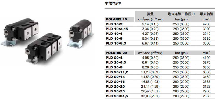 排量范圍:從2,14 cm3/rev (0.13 in3/rev) 到33,03 cm3/rev (2.01 in3/rev);分10, 20兩個(gè)規(guī)格。