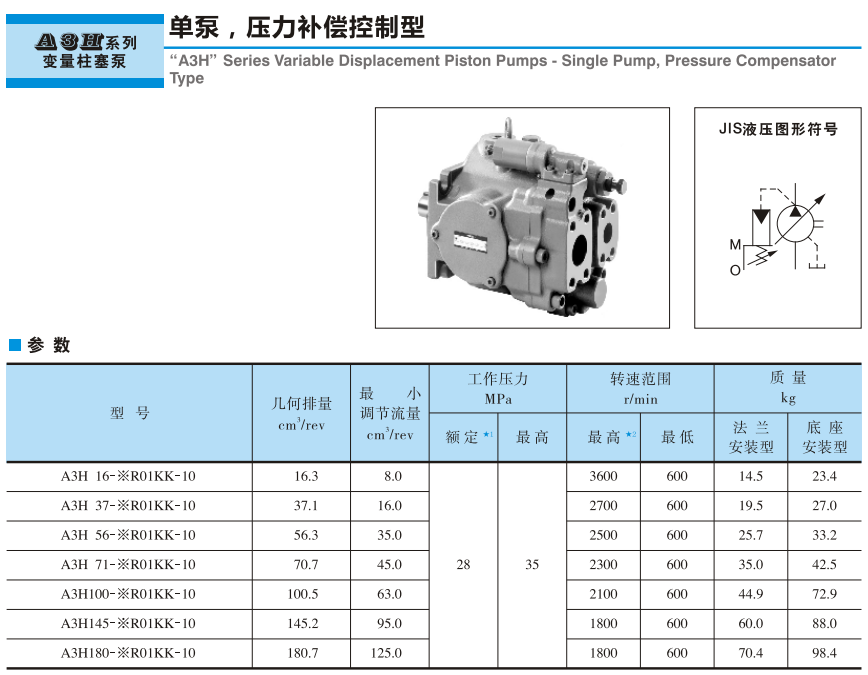 油研A3H系列高壓變量柱塞泵的主要工作參數(shù)包括: