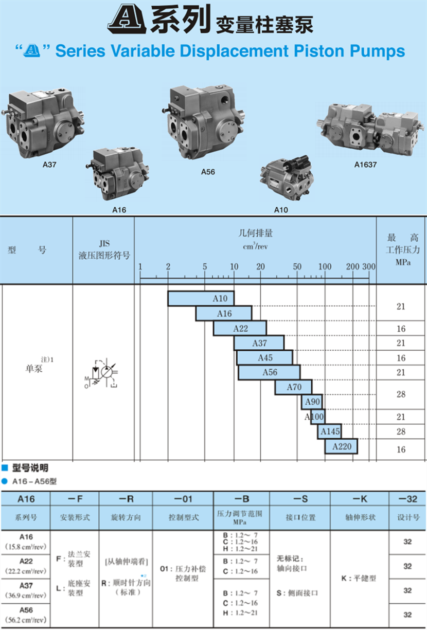 油研系列柱塞泵:A10、A16、A22、A37、A40、A45、A56、A70、A80、A90、A125、A145