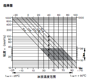 2、選擇液壓油時,在工作溫度范圍內(nèi),其粘度應(yīng)處于最佳范圍(ν最佳 )內(nèi);請參見選擇圖中的陰影部分。建議在所有情況下都選擇較高的粘度等級。