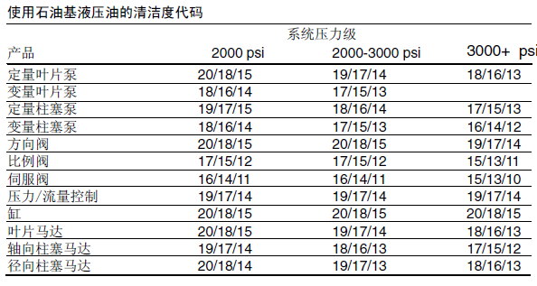 3、使用抗磨液壓油或汽車曲軸箱油時推薦的清潔度等級基于系統(tǒng)中的最高油液壓力等級并編號于下表中。其他允許的油液、重載工作循環(huán)或極端溫度是調(diào)整這些代號的理由。準(zhǔn)確的細(xì)節(jié)見威格士出版物561。