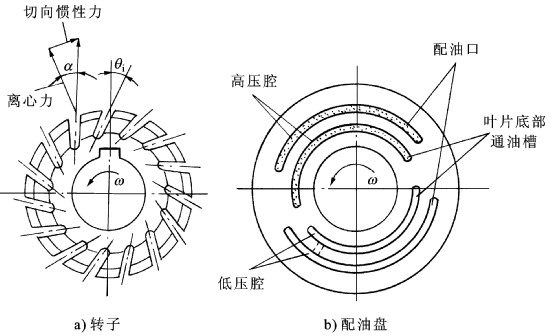上述工作原理表明,改變定子與轉(zhuǎn)子偏心距的方向也就改變了泵的吸、壓油口,即原來的吸油口變成壓油口,原來的壓油口變成吸油口;改變上述偏心距的大小意味著改變了泵的排量。 當偏心量為零時,密封容腔不會有容積變化,因此也就不具備液壓泵的工作條件了。同樣道理,為了使葉片運動自如、減小磨損,葉片槽通常向后(注意,這里與雙作用葉片泵不同)傾斜20o~30o。 圖3.20為單作用 葉片泵的配油盤和轉(zhuǎn)子結(jié)構(gòu)簡圖。